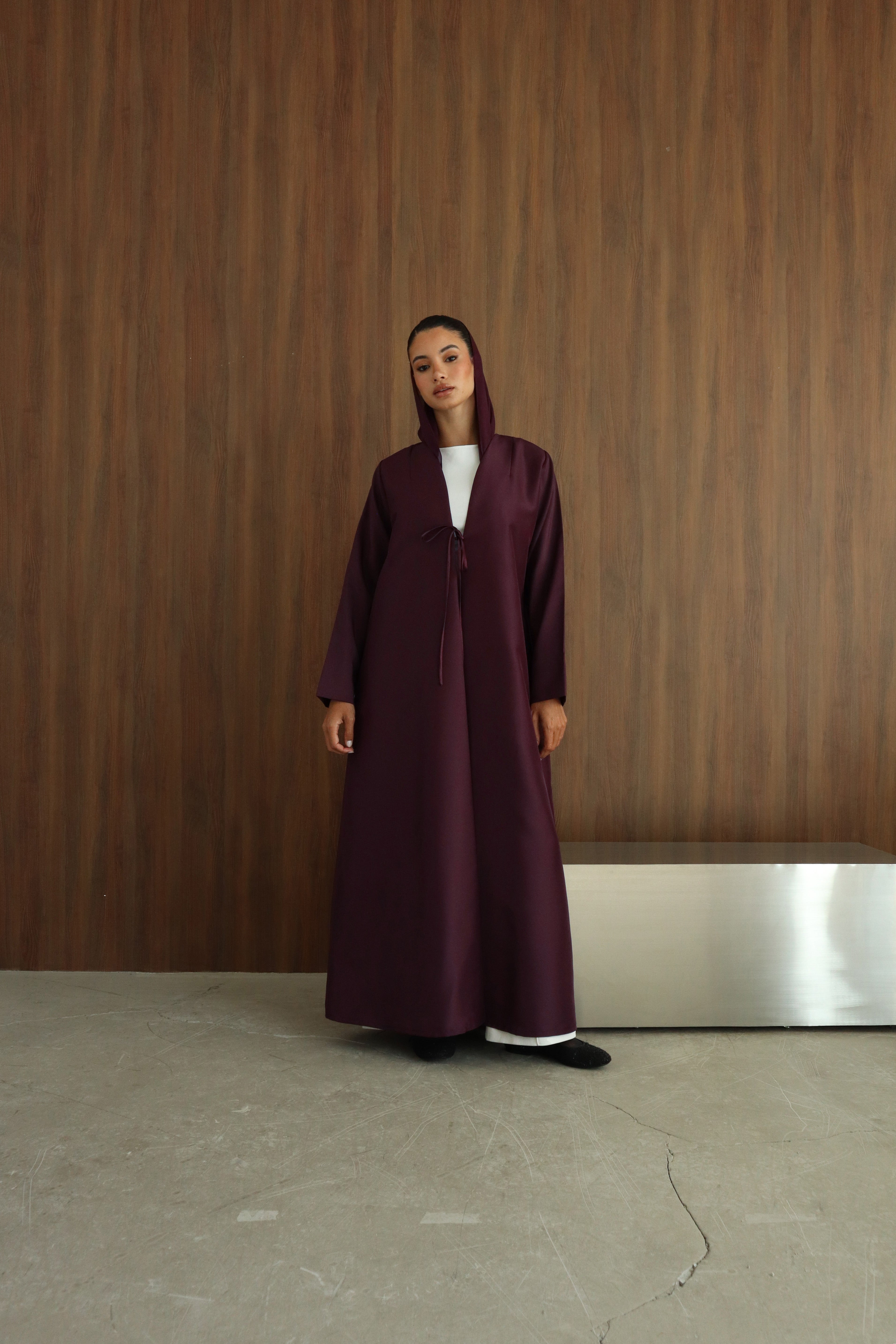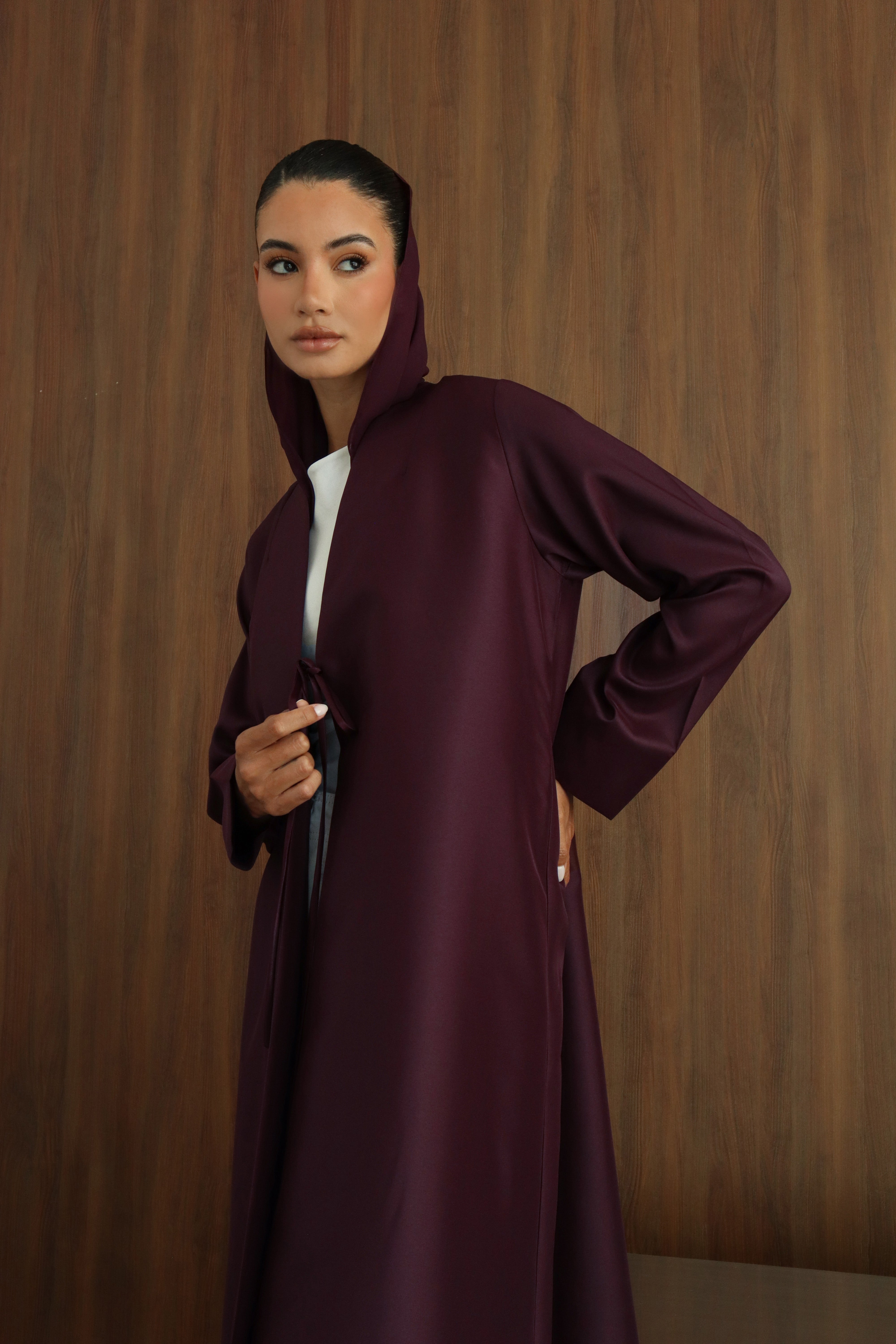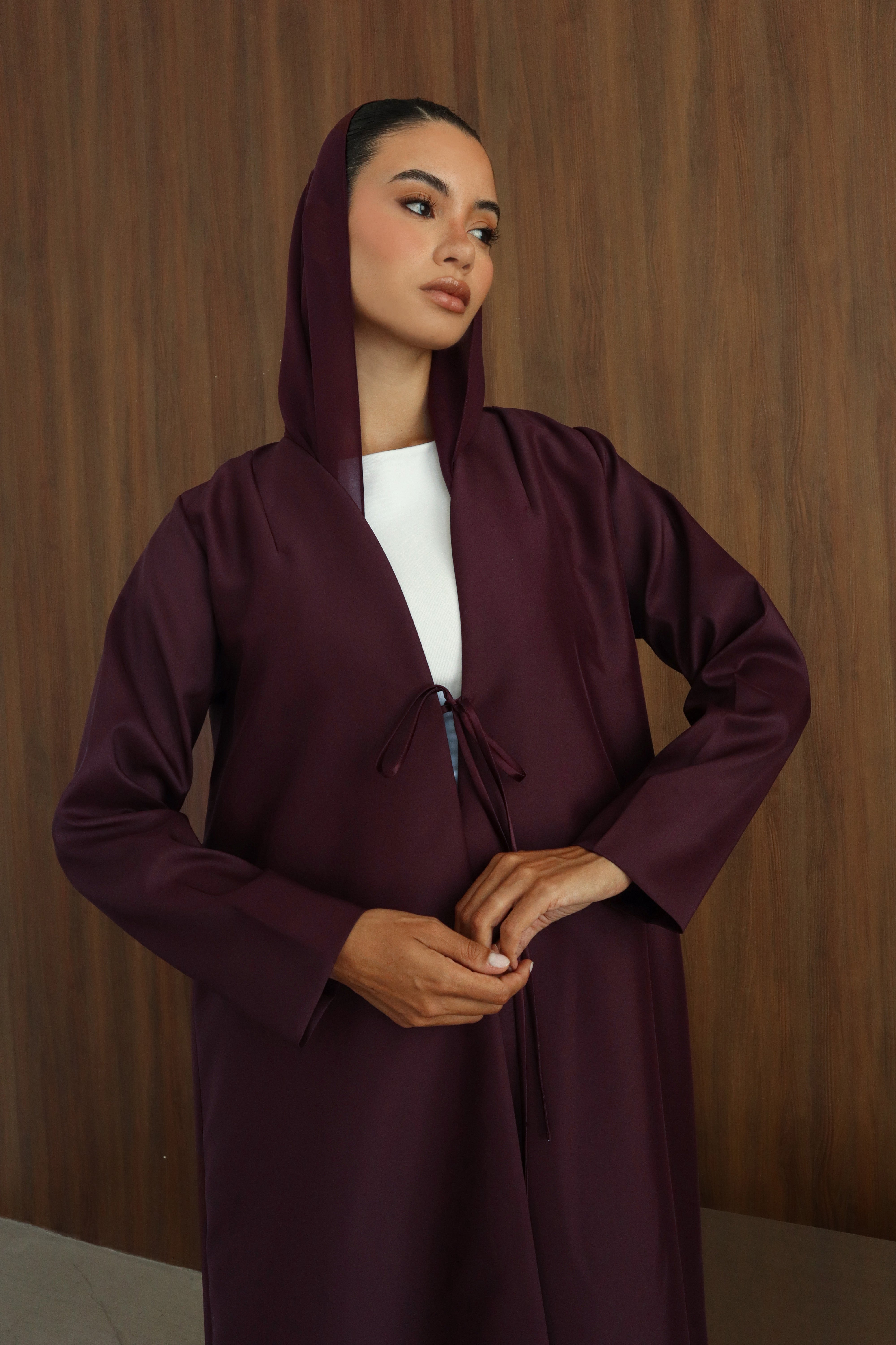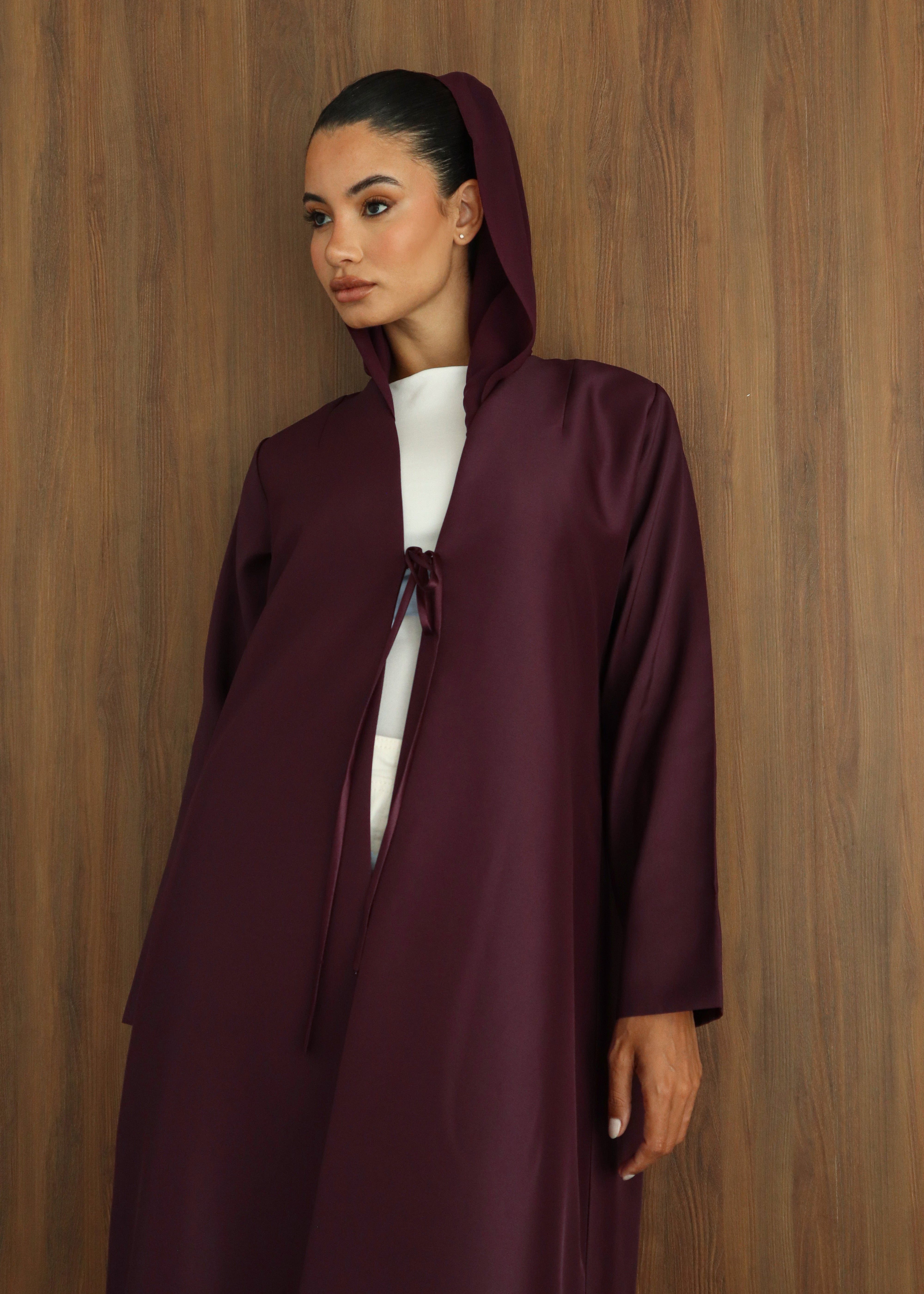 A Taffeta abaya in a V-neck design, featuring a central ribbon for a refined, minimal finish. Sleek, elegant, and effortlessly chic, it transitions beautifully from day to evening.
