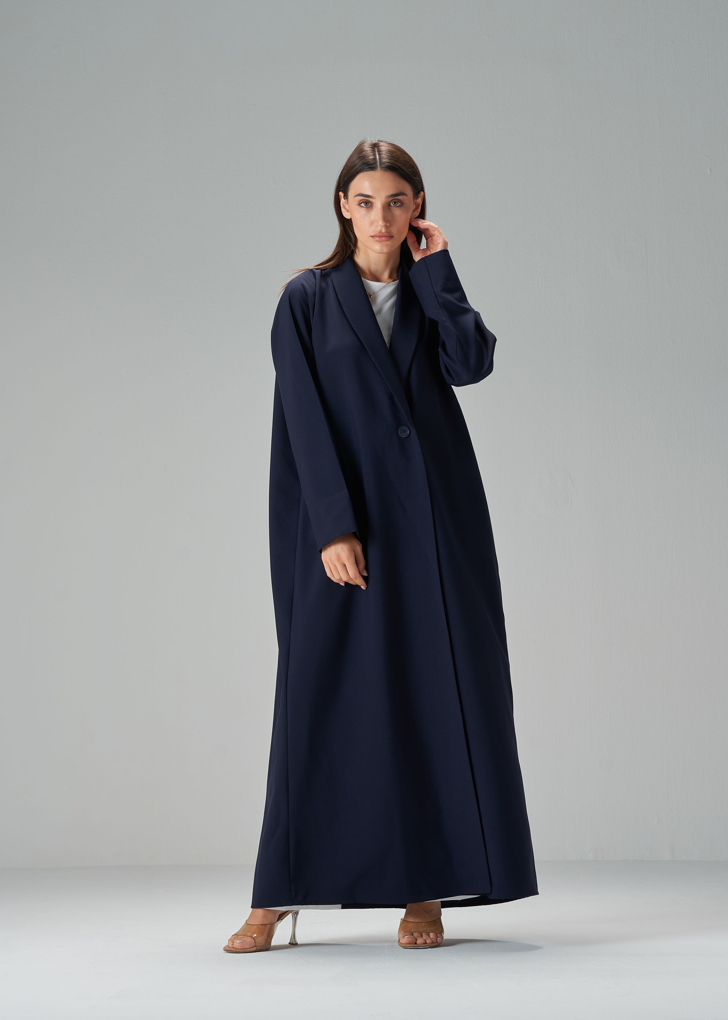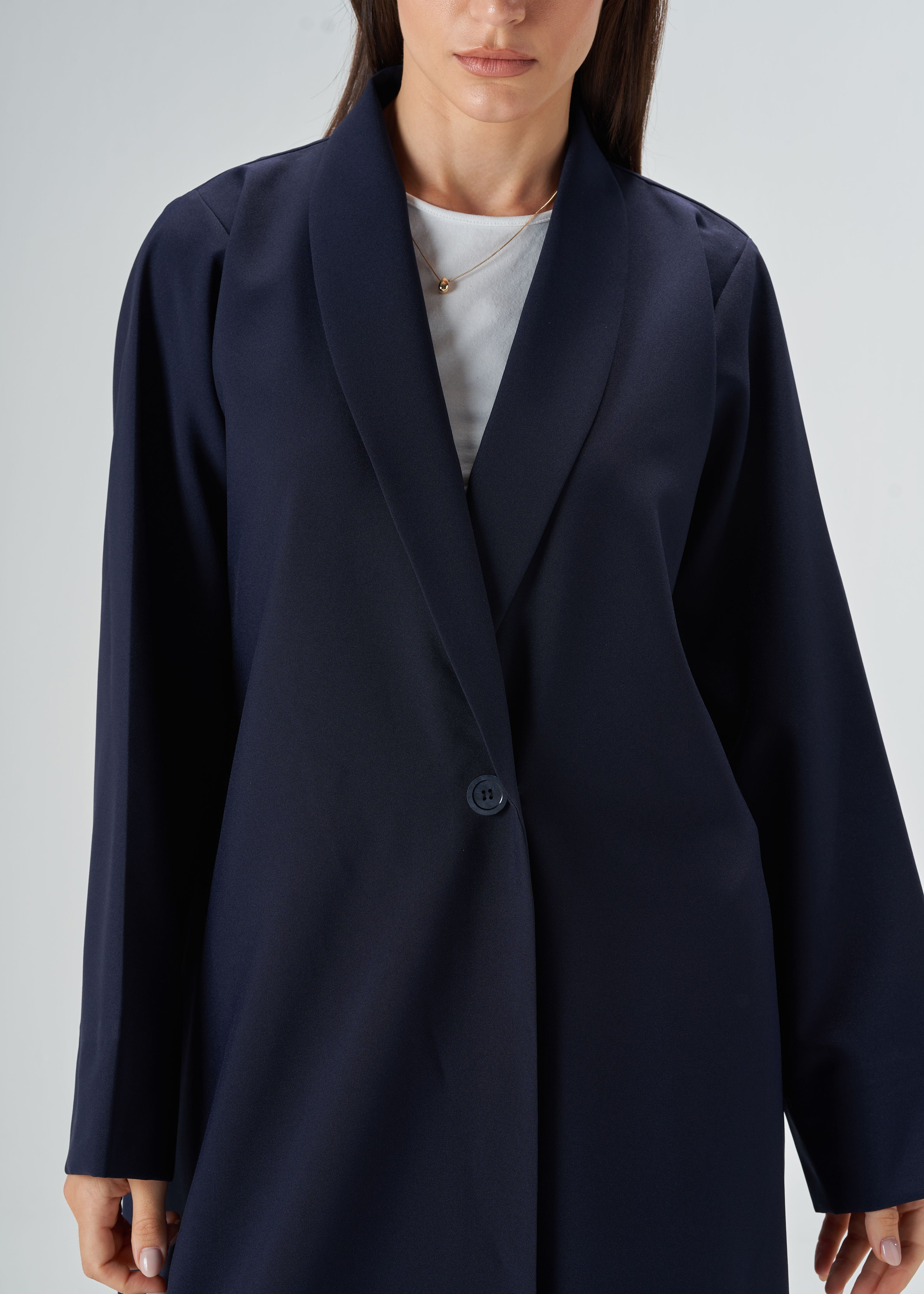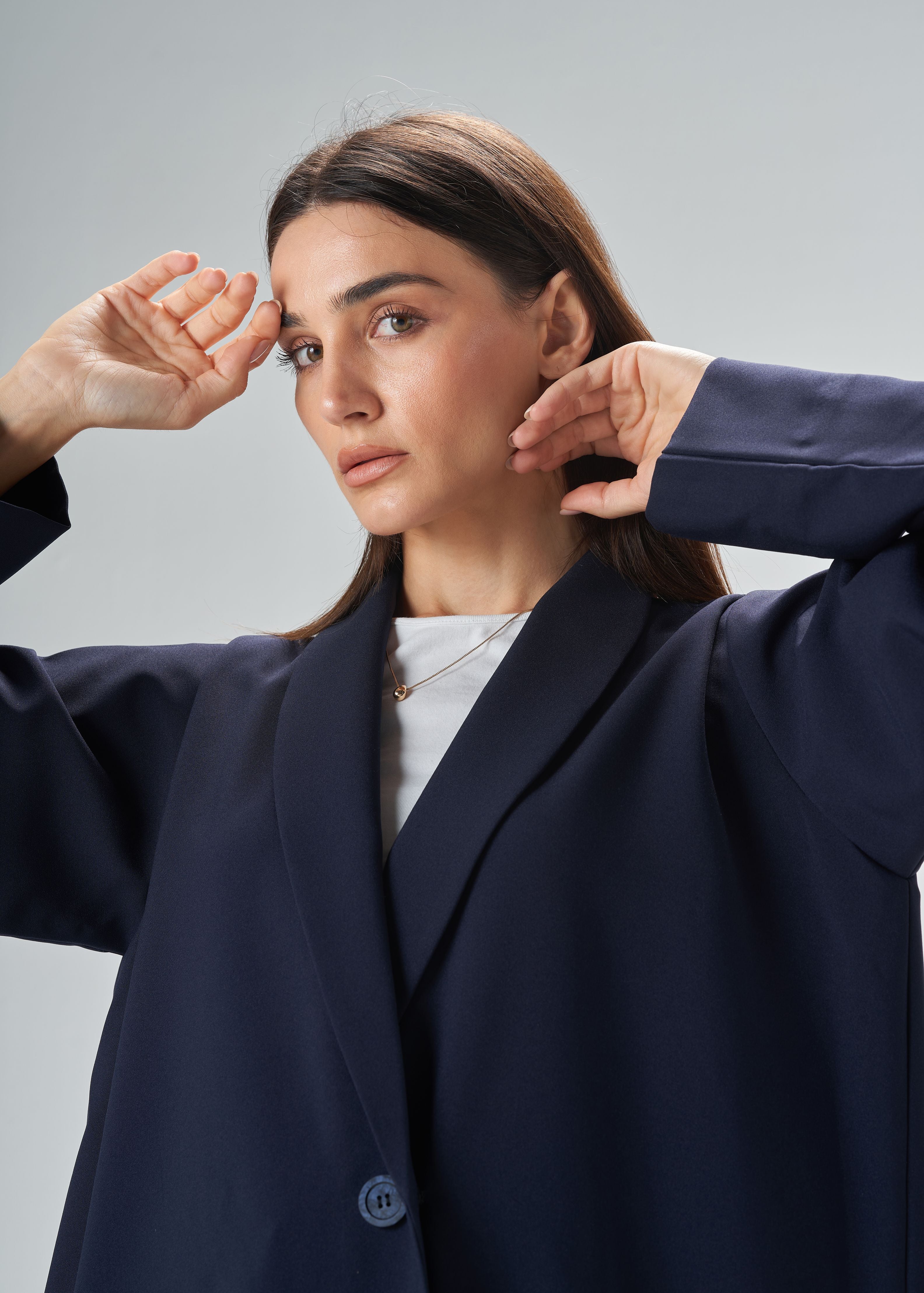 A timeless wardrobe essential crafted in dark navy with a signature center button. This classy, minimal blazer is perfect for work meetings or evening outings — structured, elegant, and effortlessly polished. Comes with a matching shaila for a complete look.