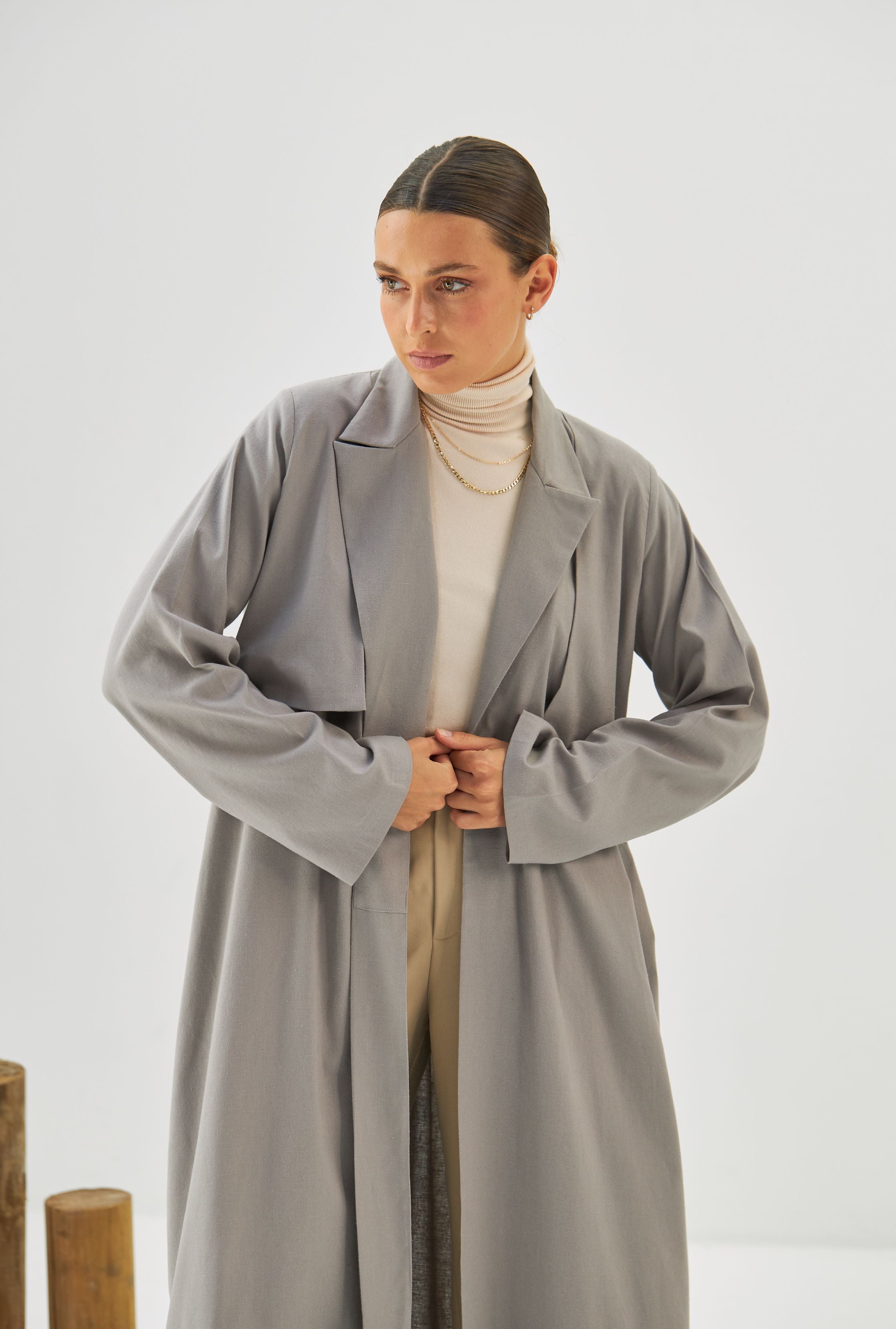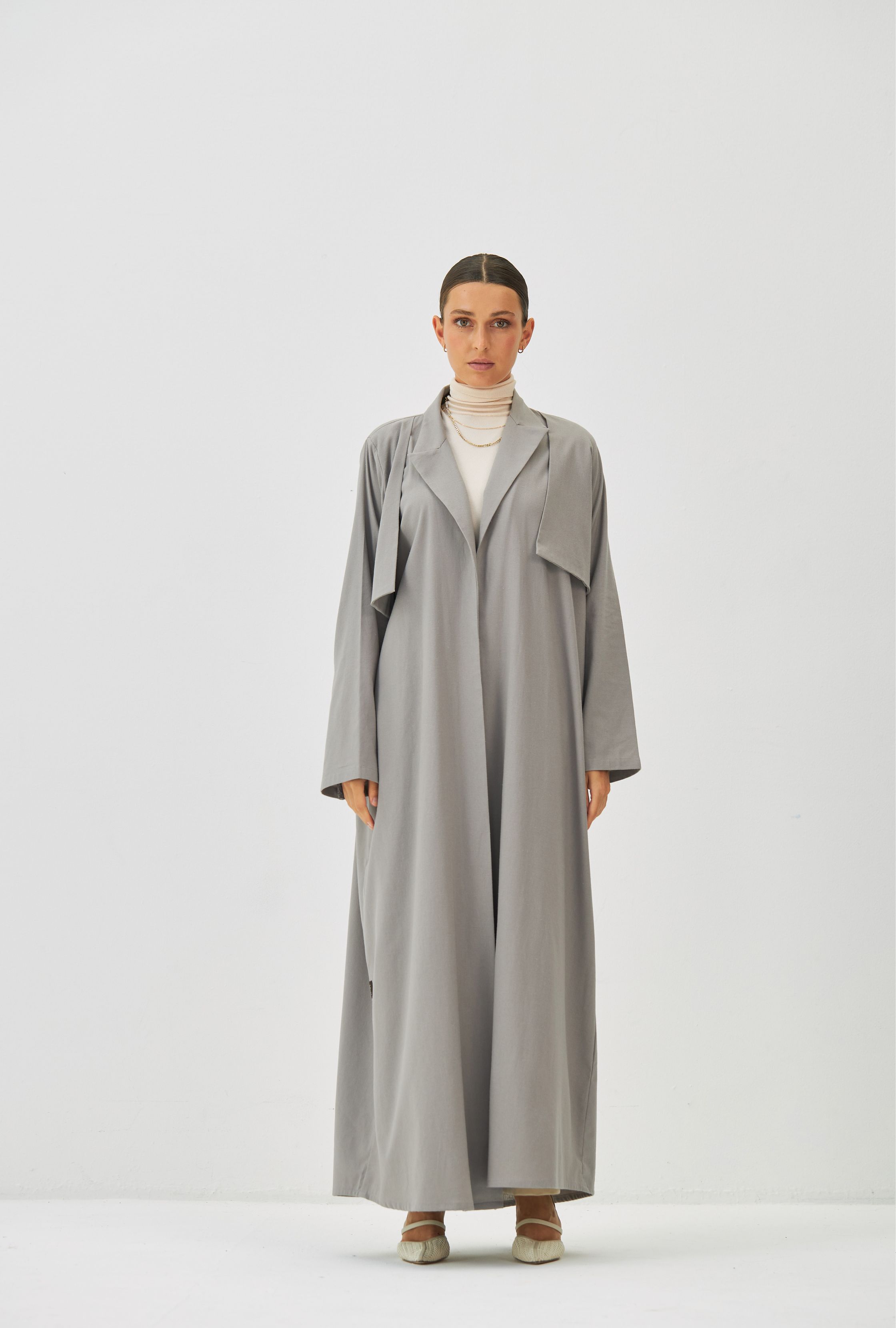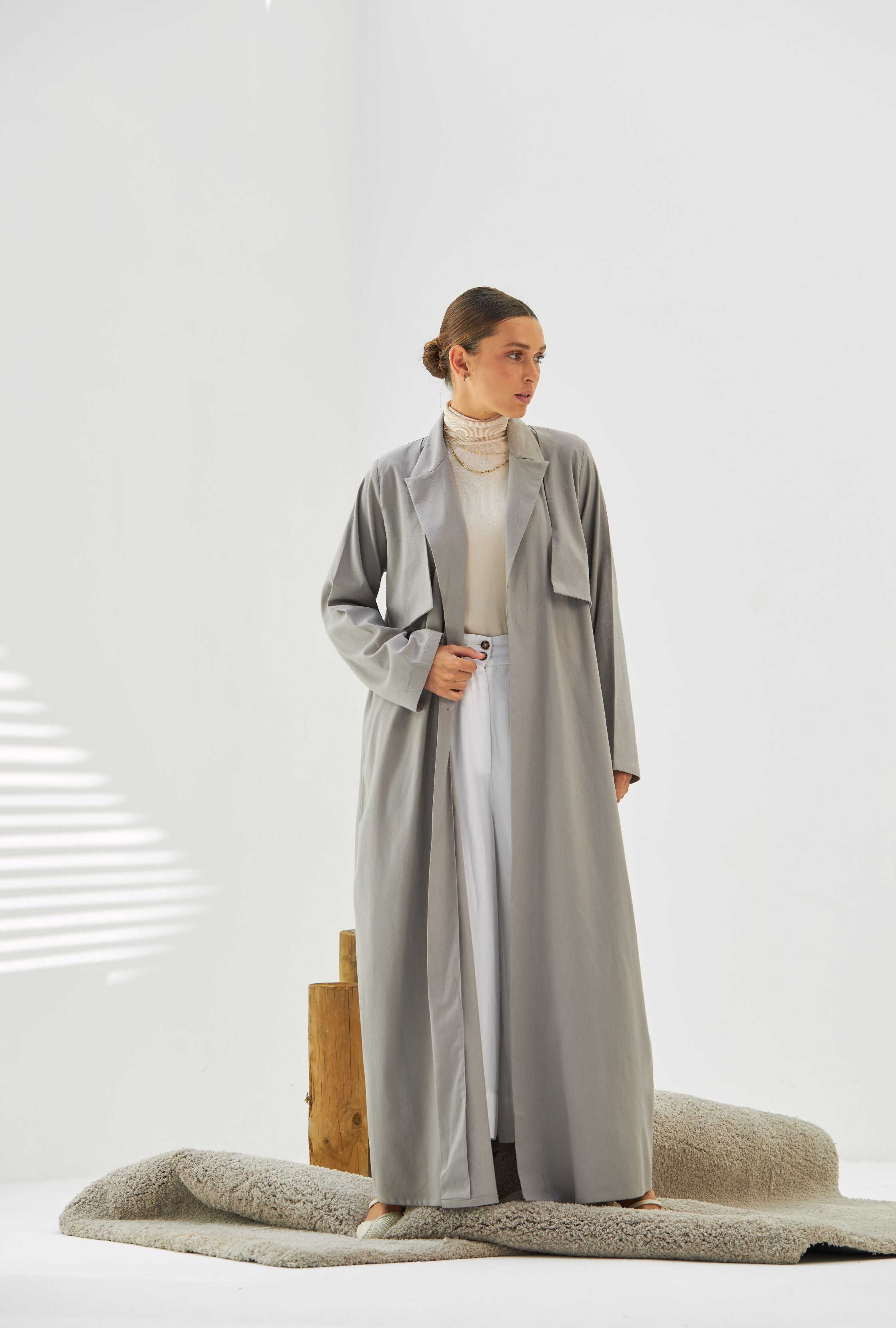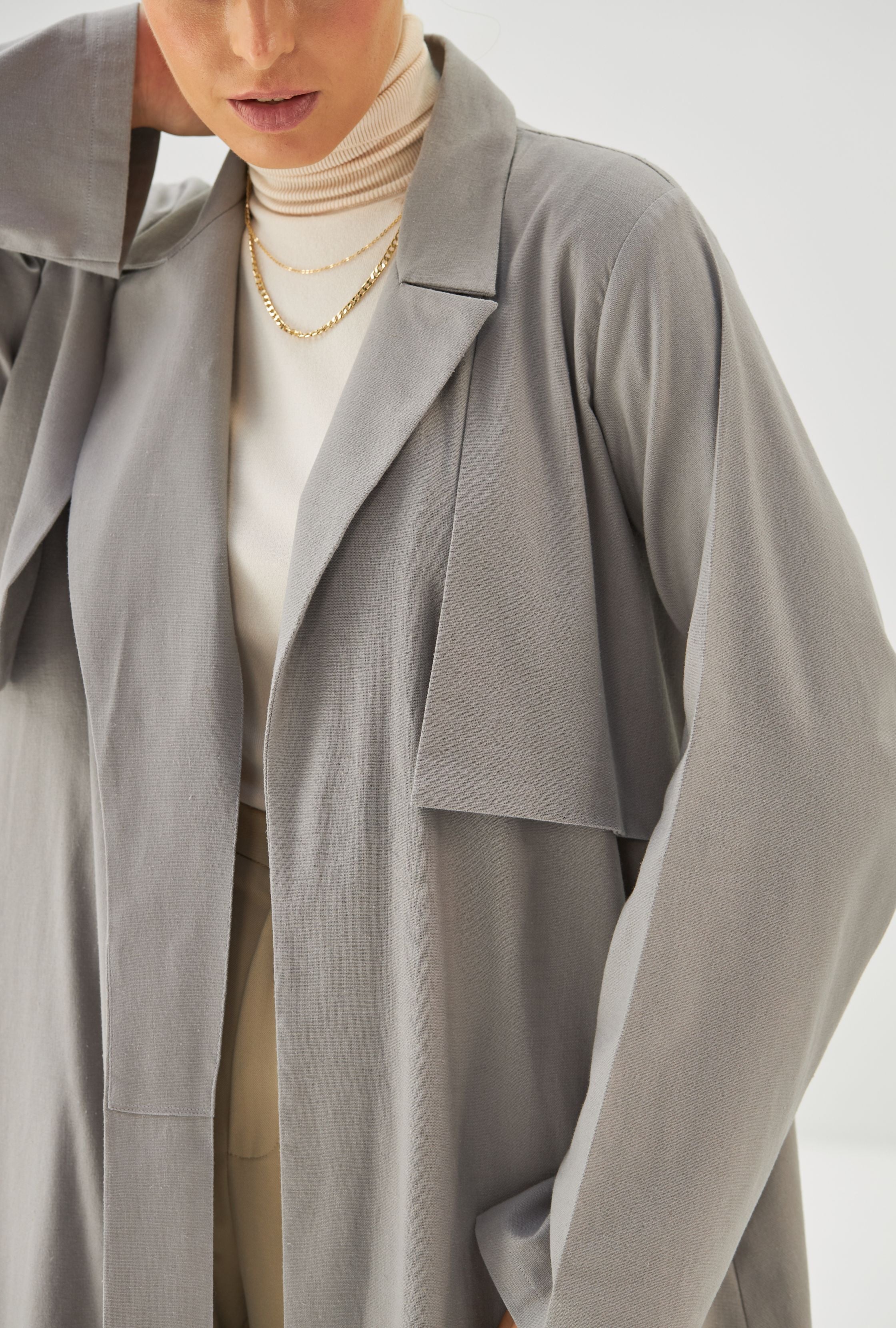 A timeless piece crafted from breathable linen in a soft gray tone. This minimal trench features a clean silhouette — perfect for layering on warm days with effortless style. Comes with a matching shaila for a complete look.