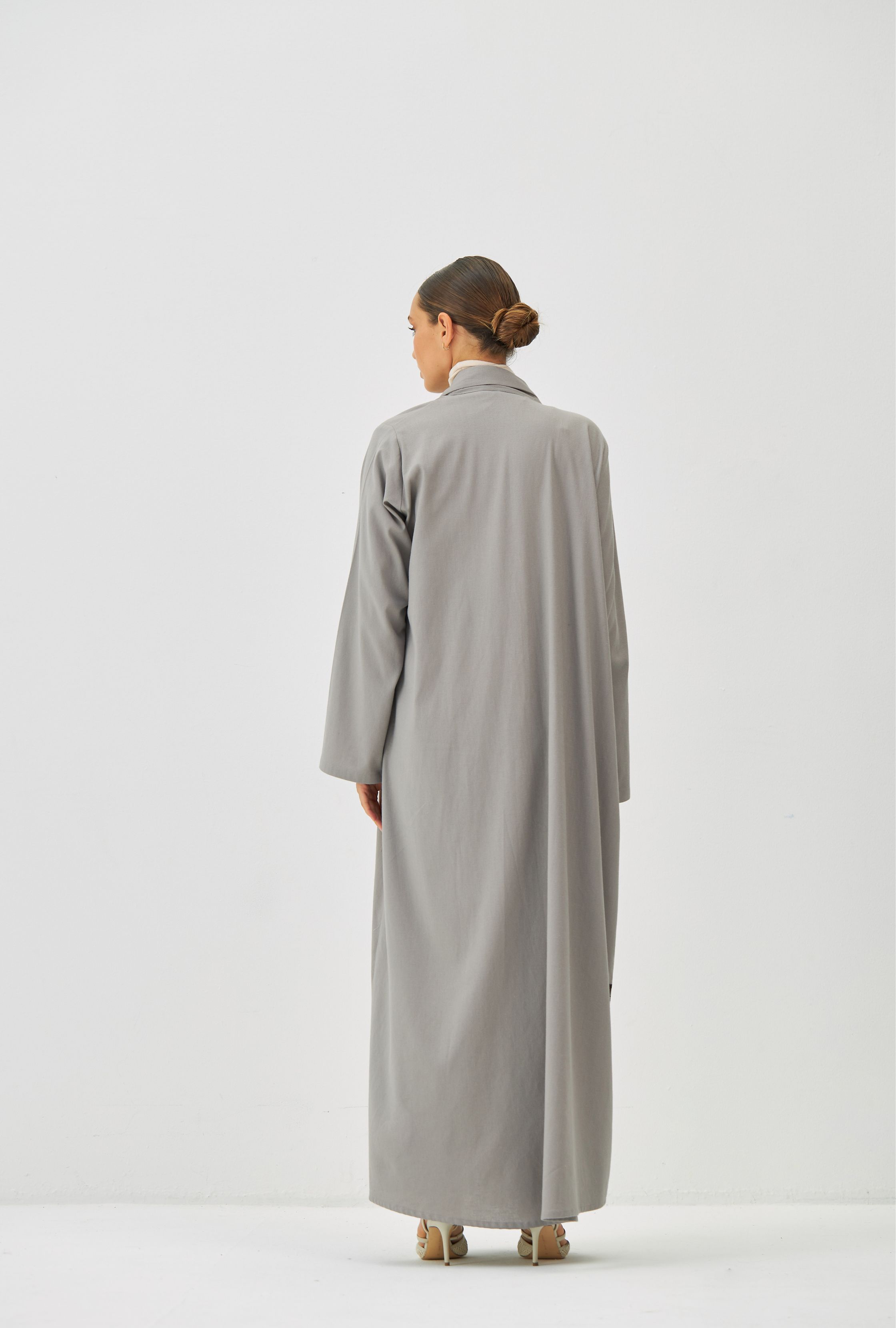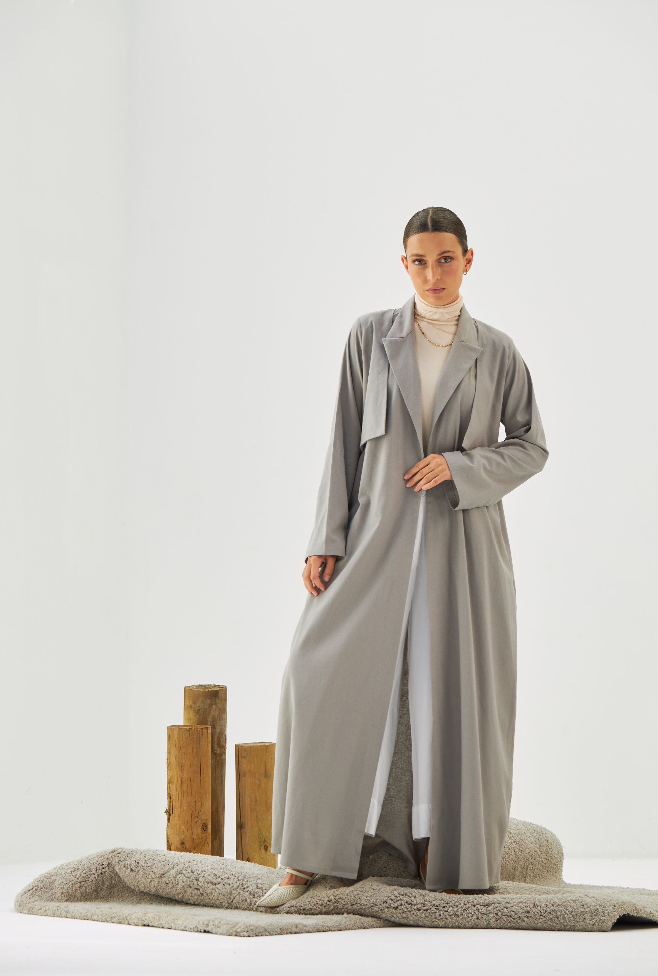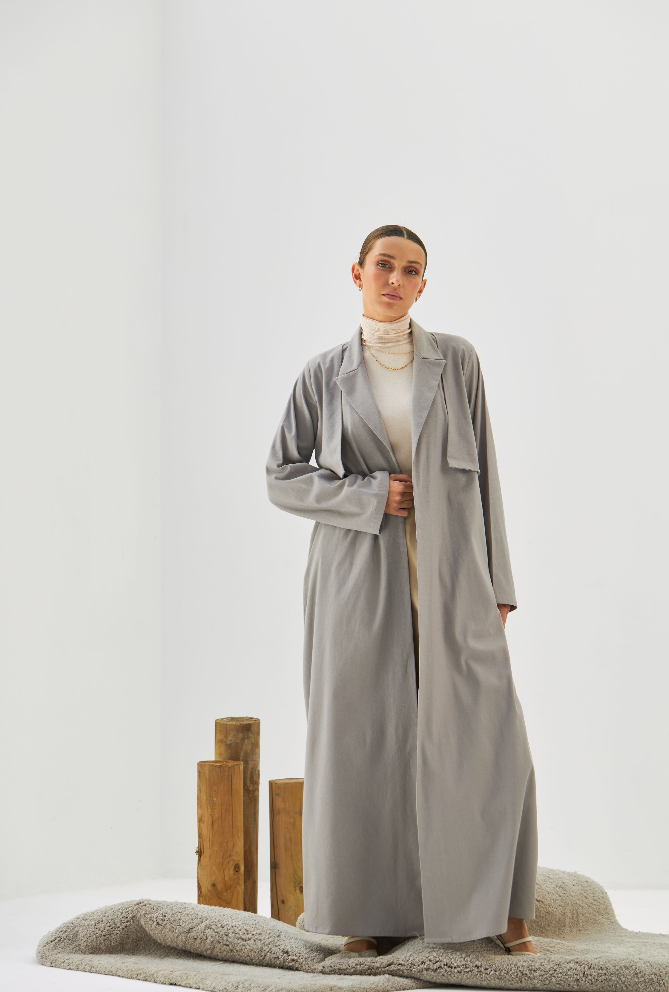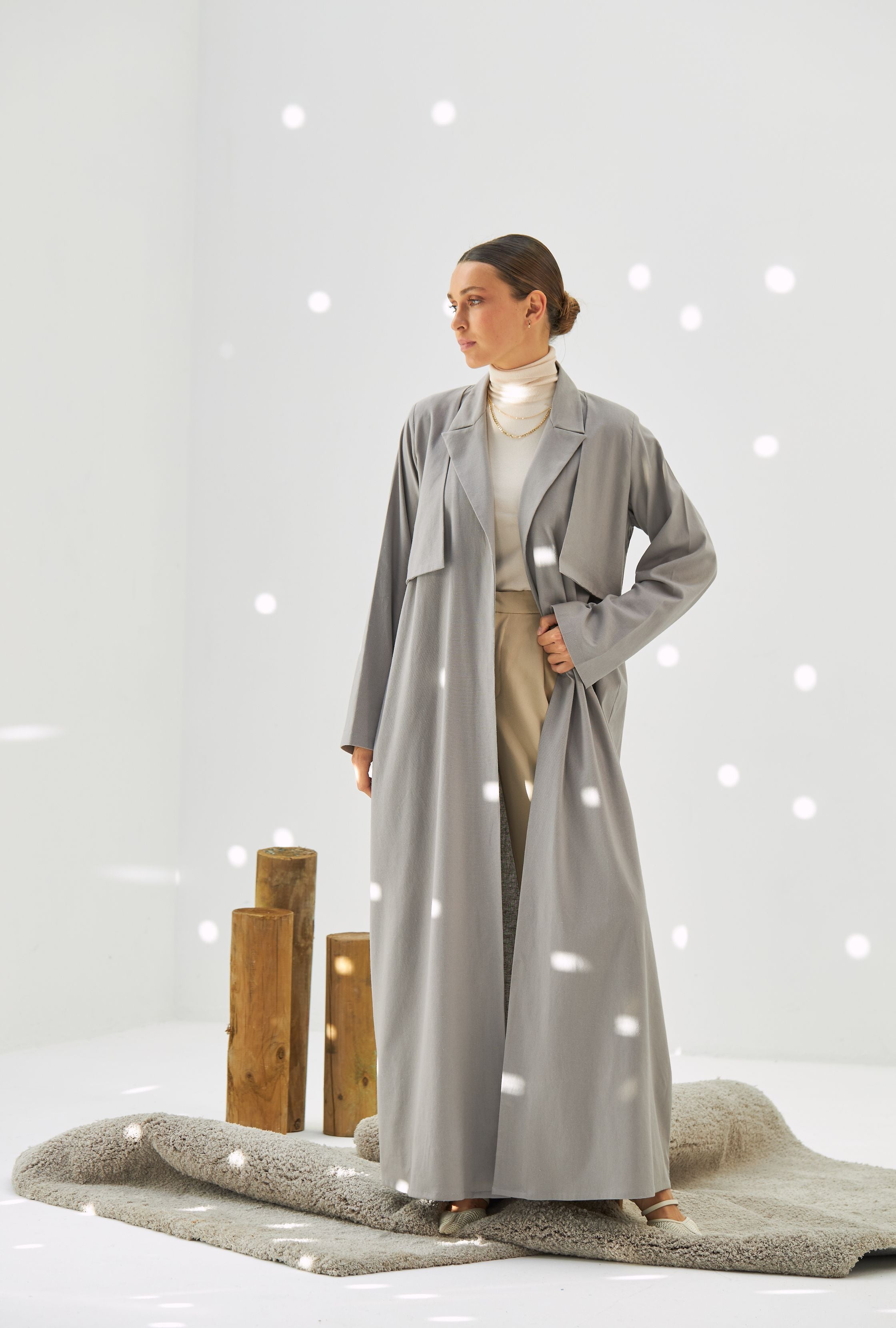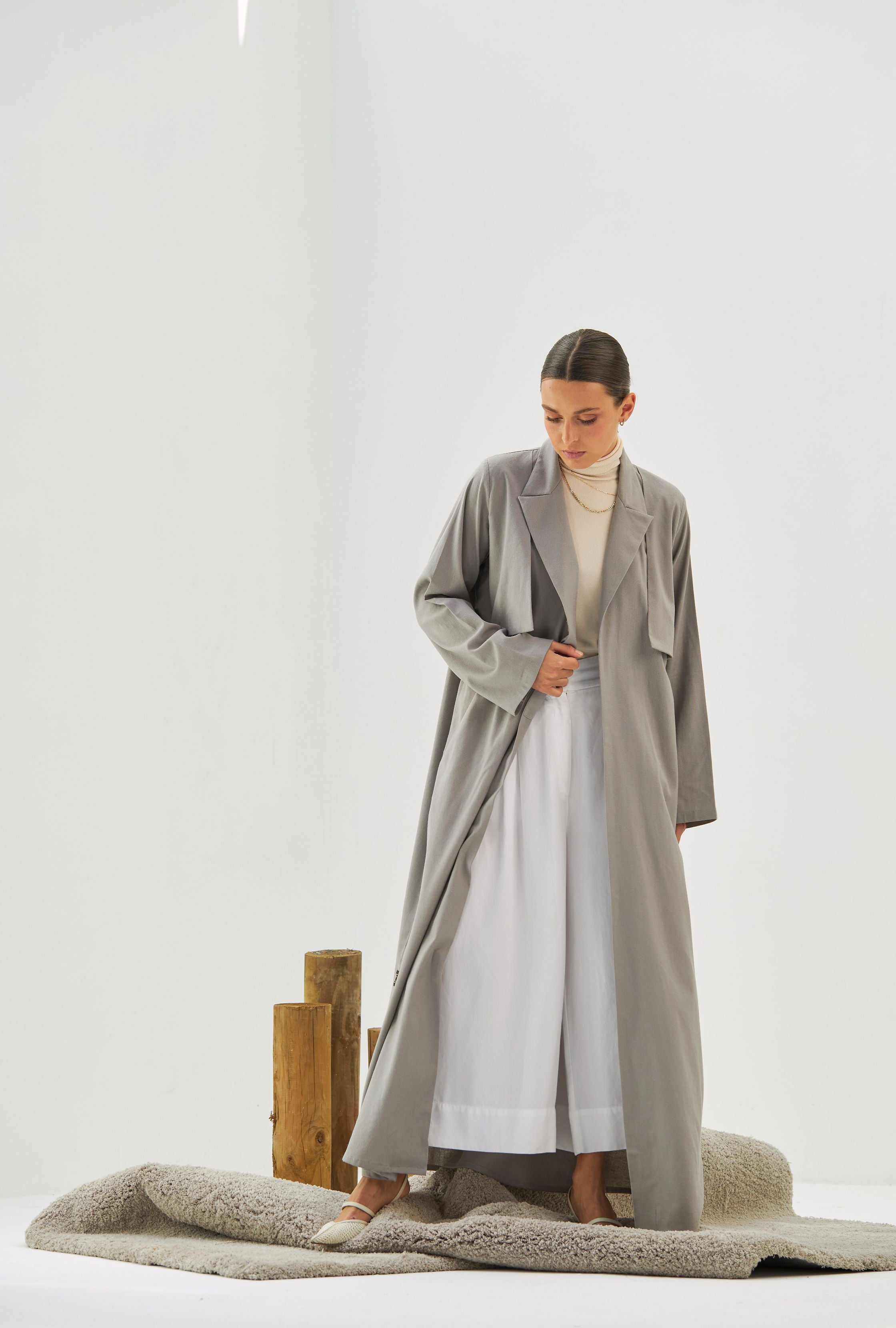 A timeless piece crafted from breathable linen in a soft gray tone. This minimal trench features a clean silhouette — perfect for layering on warm days with effortless style. Comes with a matching shaila for a complete look.